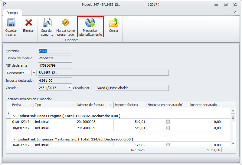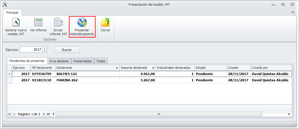 Desde la ficha de una declaración pendiente de presentar se puede también realizar la presentación telemática.