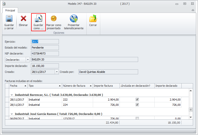 Desde la opción Guardar como se genera el fichero para presentar a la AEAT. Se debe guardar en algún lugar del ordenador (por ejemplo C:\AEAT) para luego enviarlo a la Agencia Tributaria.