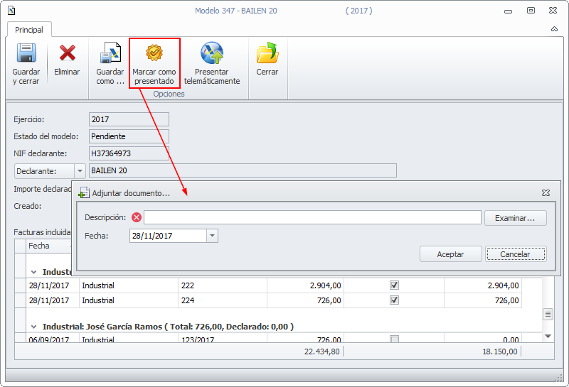 En el caso de que la declaración no se presente con adminet, tras la presentación debe entrarse en cada una de las declaraciones y hacer clic en el botón Marcar como presentado. Le permite cargar el fichero pdf de la declaración presentada y pasa la declaración a la pestaña Presentados.
