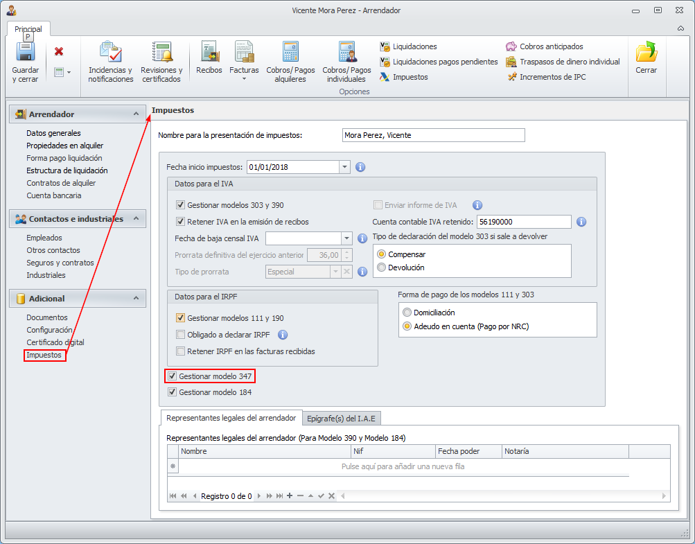 Como que el programa no puede saber cual es el valor catastral del conjunto de propiedades del arrendador, es imprescindible activar la casilla Gestionar modelo 347 en la sección Impuestos de la ficha del arrendador para que el programa lo genere.