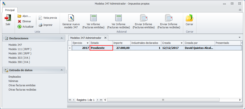 En el caso del administrador, el modelo generado aparece automáticamente en la lista de modelos 347. La columna Estado indica que está Pendiente de presentar.