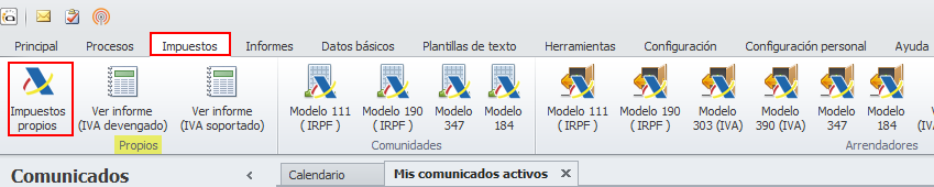 Para procesar los modelos 347 vaya al menú Impuestos y, dentro del apartado correspondiente, haga clic en el botón Modelo 347. En el caso del administrador, se accede a la opción del modelo 347 tras hacer clic en el botón Impuestos propios.