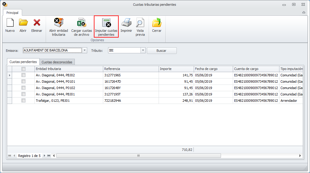 Al proceso Imputar cuotas pendientes se accede desde el botón Cuotas tributarias del menú Impuestos. Realiza, para los tributos que se seleccionen, las siguientes operaciones: