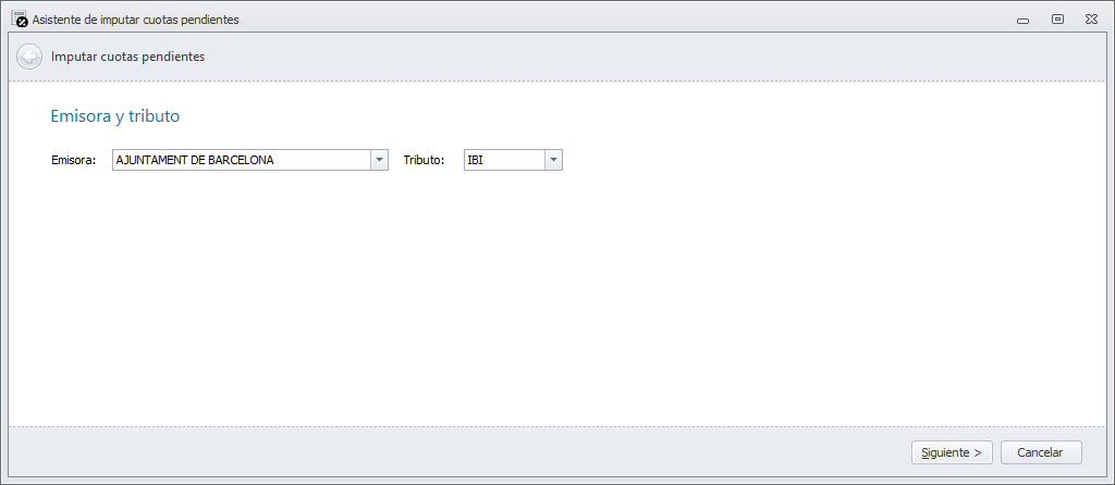 Se abre el asistente para realizar una nueva imputación. La primera ventana solicita la entidad emisora y el tributo a imputar.