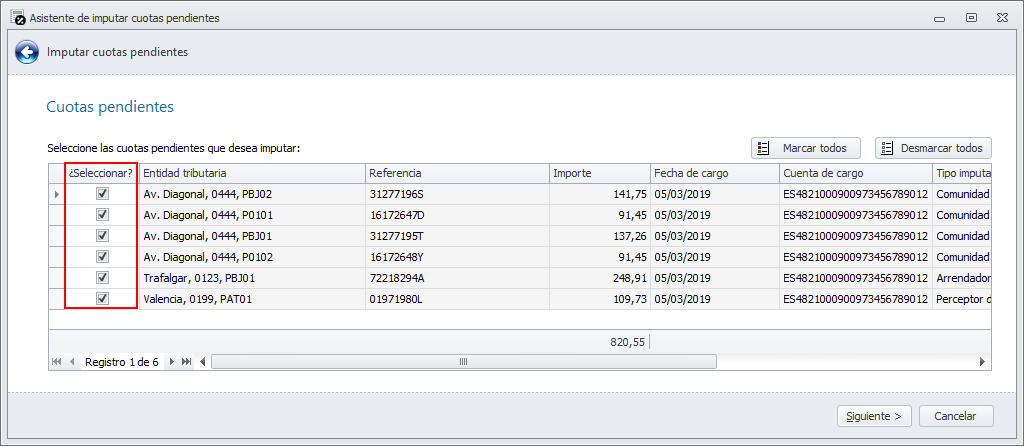Al hacer clic en Siguiente se muestra la lista de cuotas tributarias cargadas. Puede desmarcar alguna, si no la desea procesar.