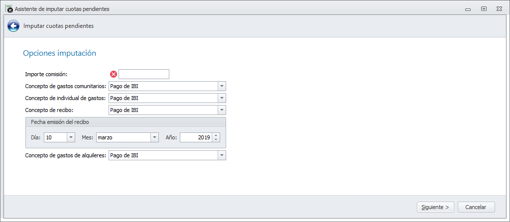 Fecha emisión del recibo: Indique la fecha con la que se debe emitir el recibo por aquellas entidades tributarias cuyo tipo de imputación sea Comunidad (Gasto individual + Cuota puntual). El programa calcula y propone, por defecto, la próxima fecha en que se deben emitir recibos. Para las entidades tributarias cuyo tipo de imputación sea Comunidad (Gasto individual + Otra cuota) el recibo se emitirá junto al de cuota ordinaria.