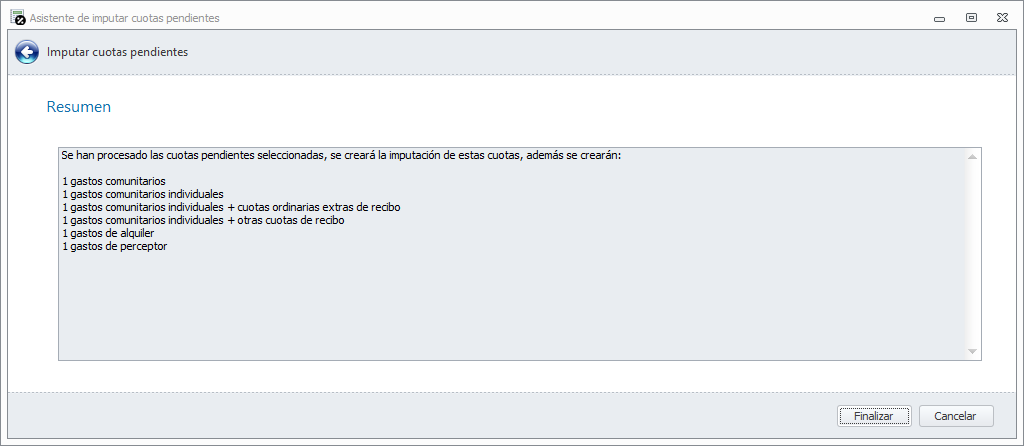 Por último, el asistente muestra un resumen de las cuotas que se van a procesar.