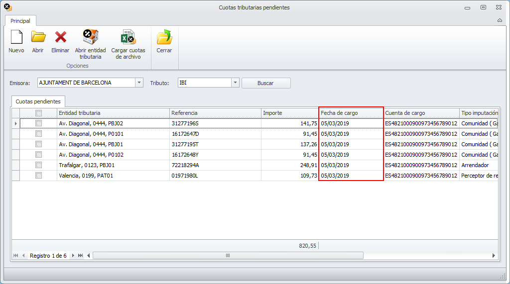 La fecha de contabilización del pago del tributo será la que esté indicada en las cuotas pendientes como fecha de cargo.