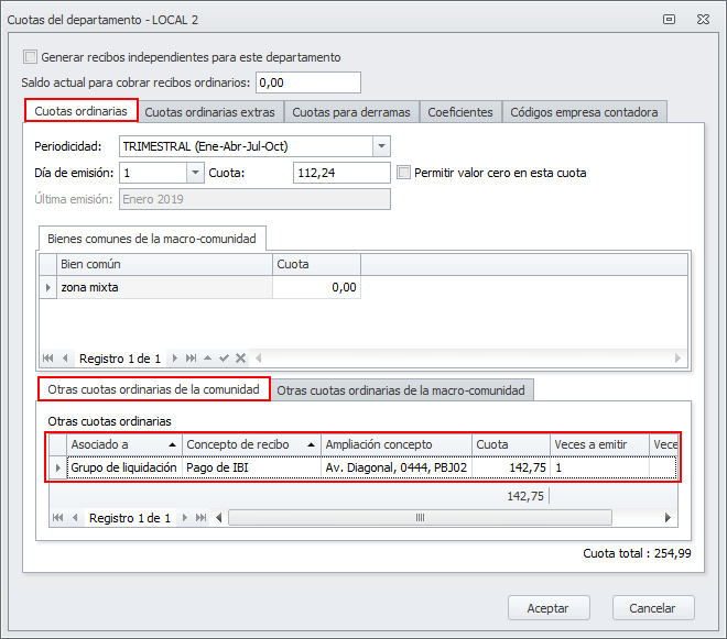 Para las entidades tributarias cuyo tipo de imputación sea Comunidad (Gasto individual + Otra cuota) se ha añadido al departamento vinculado en su ficha una cuota ordinaria extra, que se emitirá en la fecha indicada en el asistente.