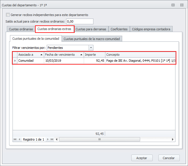 Para aquellas entidades tributarias cuyo tipo de imputación sea Comunidad (Gasto individual + Cuota puntual) se ha añadido al departamento vinculado en su ficha una cuota adicional, que se emitirá junto a la cuota ordinaria.
