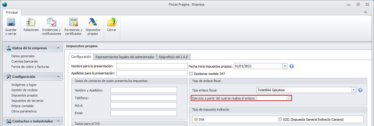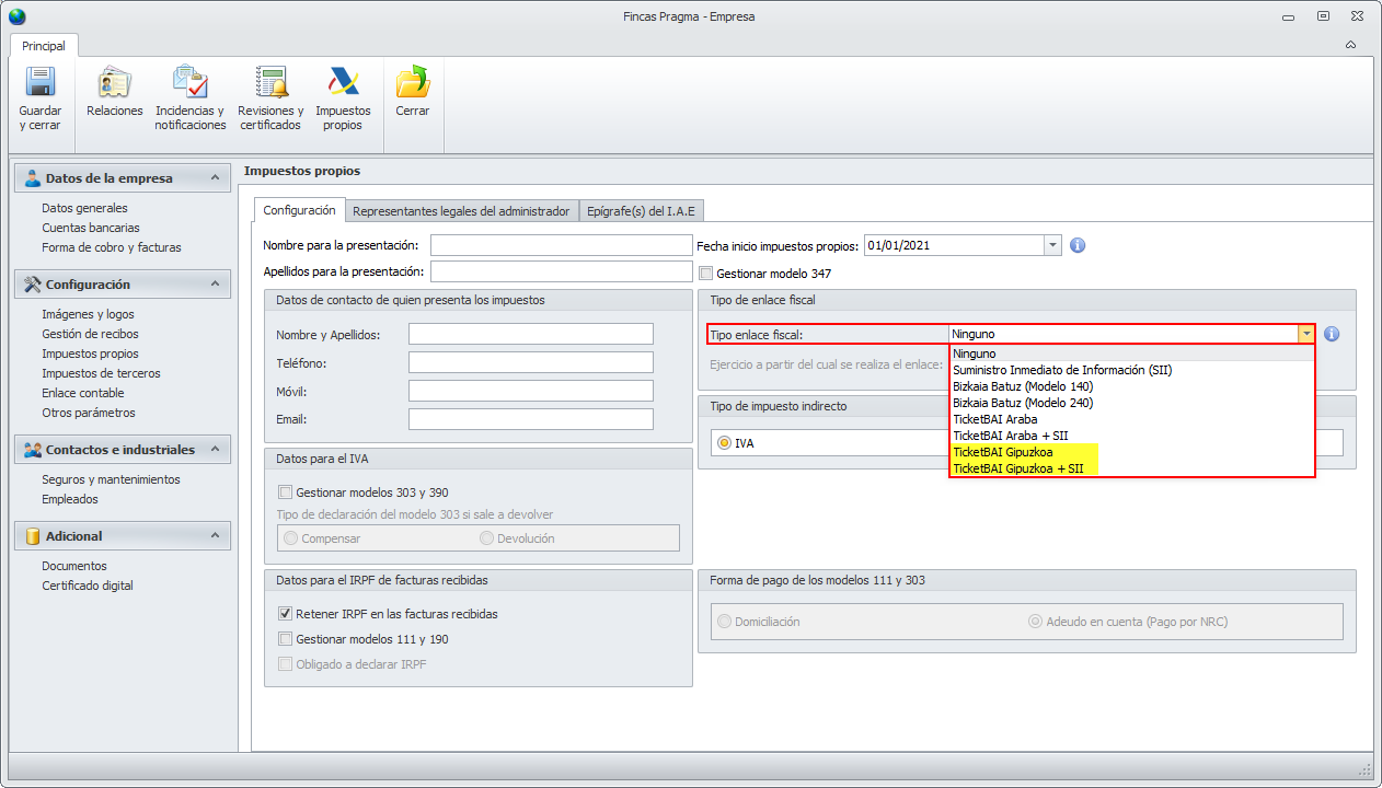 Para activar Ticketbai Gipuzkoa, se debe acceder a la sección Impuestos propios de la ficha de Empresa y activar la opción de Tipo enlace fiscal que corresponda.