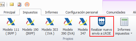En el menú Impuestos puede ver un botón Realizar nuevo envío a LROE.