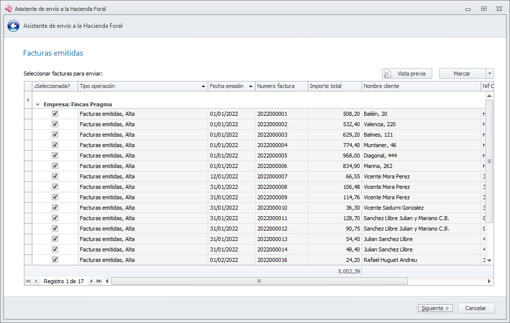 Al hacer clic en este botón, se abre un asistente para la cumplimentación del envío. En primer lugar muestra una lista de las facturas emitidas que se van a incluir. Son las facturas del mismo ejercicio indicado en la ficha de Empresa y posteriores que todavía no han sido informadas. Permite realizar la exclusión de alguna si se desea omitir por el momento.