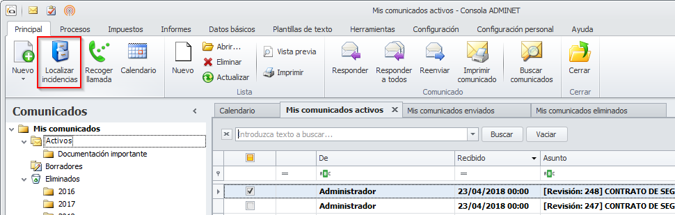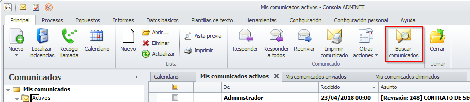 De este modo se pueden ver los comunicados independientemente de si están en una bandeja de activos como si está en la de eliminados o enviados.