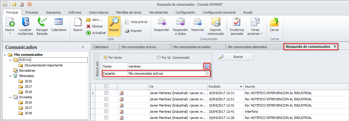 La búsqueda de comunicados, en este caso, se realiza en todas las carpetas de comunicados de todos los usuarios, respetando siempre las reglas derivadas de los permisos de usuarios.