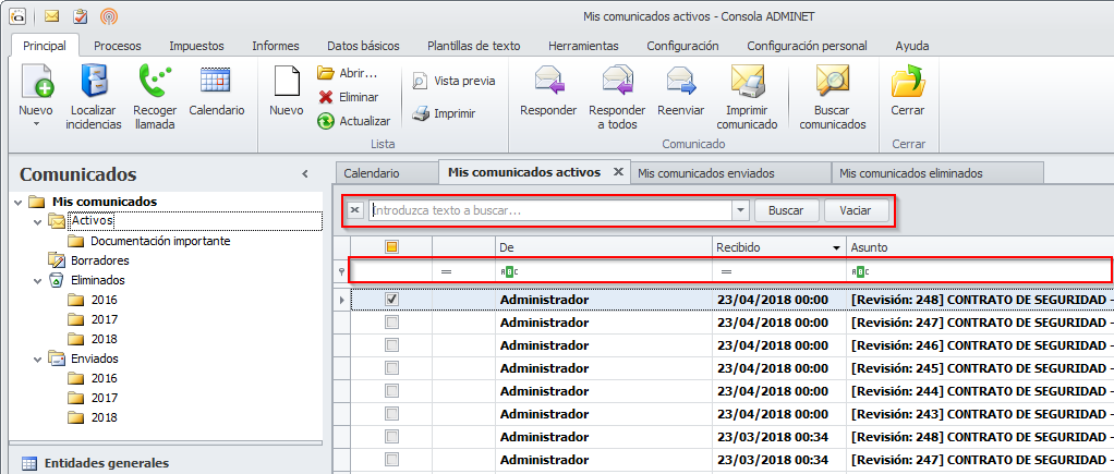 En cualquier carpeta de comunicados se puede activar el panel de búsqueda o la fila de filtrado para localizar un comunicado a partir de los datos que componen las columnas de la vista. Haga clic aquí para ver las ventajas de las vistas en adminet.