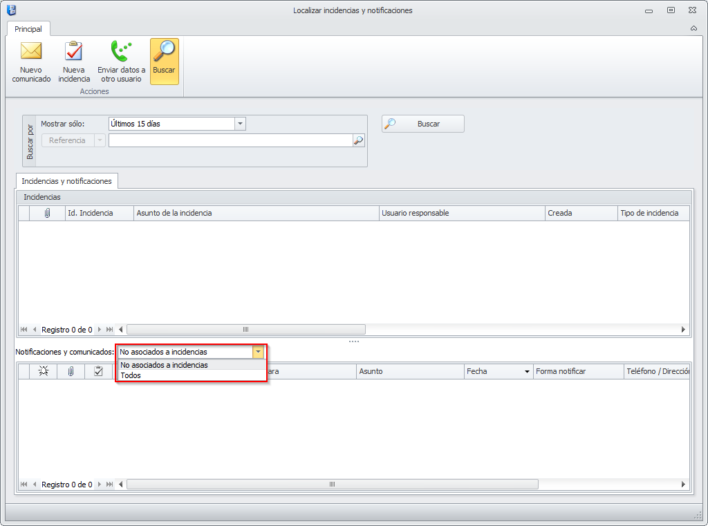 El botón Localizar incidencias se encuentra en la cinta de botones del menú Principal.
