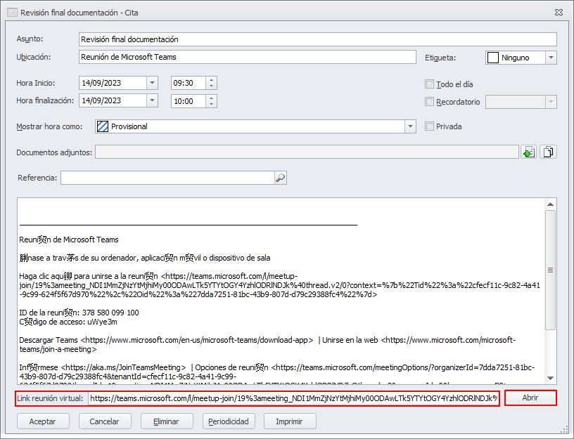 Al abrir una cita, si dispone de un enlace para la reunión virtual, puede guardarla en la casilla Link reunión virtual. Posteriormente, desde la propia cita puede acceder a esa reunión mediante el botón Abrir situado a su derecha.