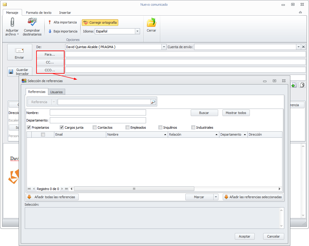 El formulario Selección de referencias se muestra al hacer clic en los botones Para, CC y CCO de un nuevo comunicado.