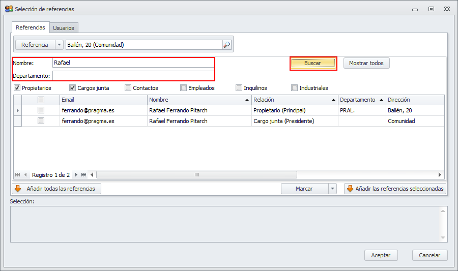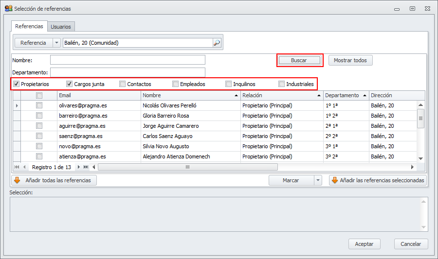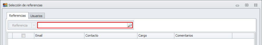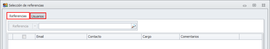 Referencias. Desde esta pestaña puede buscar una referencia (comunidad, macro, arrendador, perceptor, cliente, proveedor, industrial, etc.) y escoger el destinatario entre los contactos de dicha referencia.