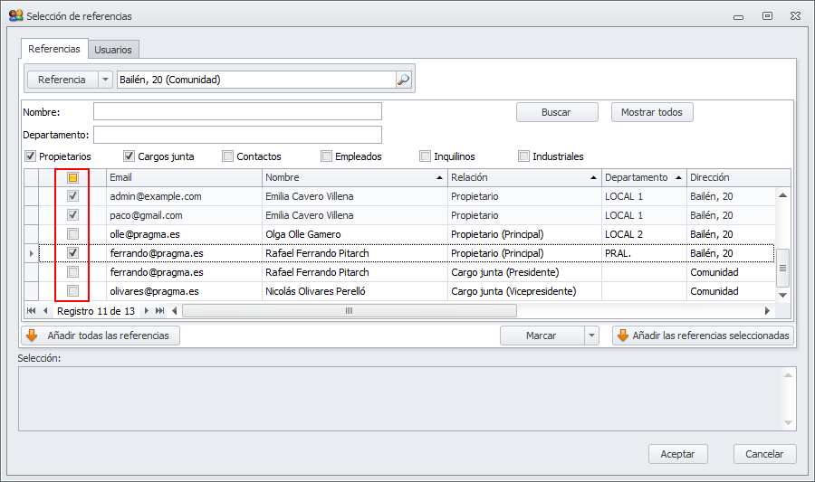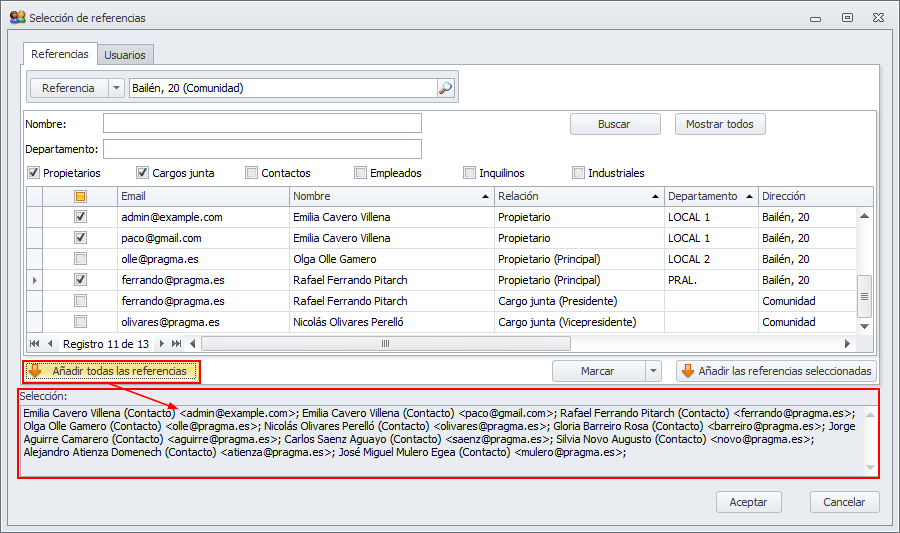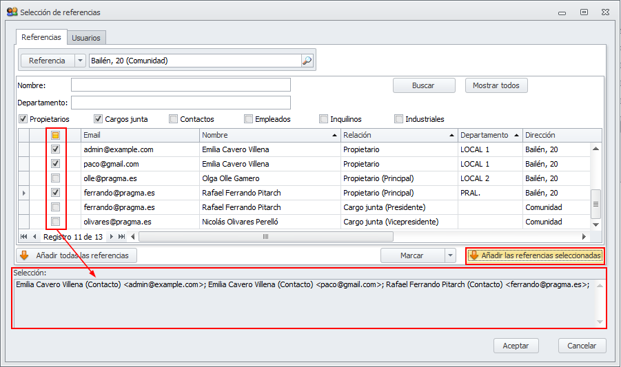 El botón Añadir las referencias seleccionadas añade a la lista de destinatarios seleccionados de la parte inferior de la ventana los contactos que tenga seleccionados en la lista.
