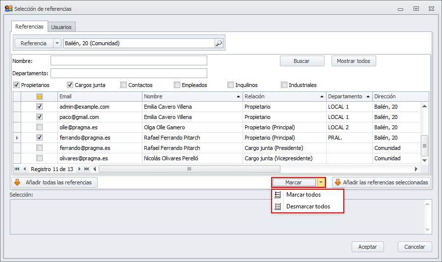 El botón Añadir todas las referencias, añade todos los contactos a la lista de destinatarios seleccionados, independientemente de si están marcados o no. Los añade todos.