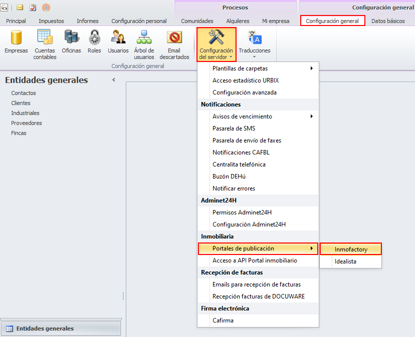 Para publicar en portales a través de Inmofactory, debe acceder al menú Configuración general, hacer clic en el botón Configuración del servidor y escoger Portales de publicación e Inmofactory.