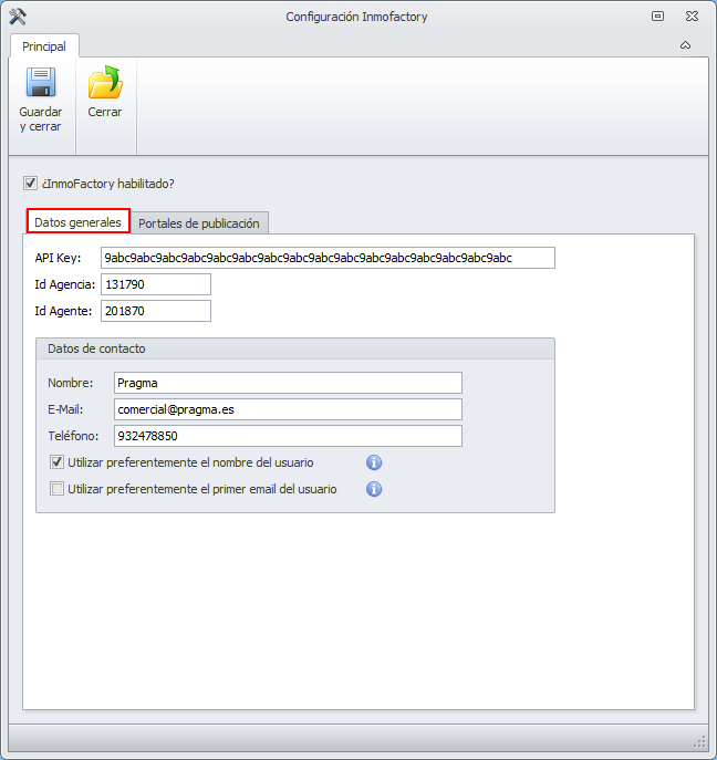Se abre la ventana de configuración. Active la casilla ¿Inmofactory habilitado?