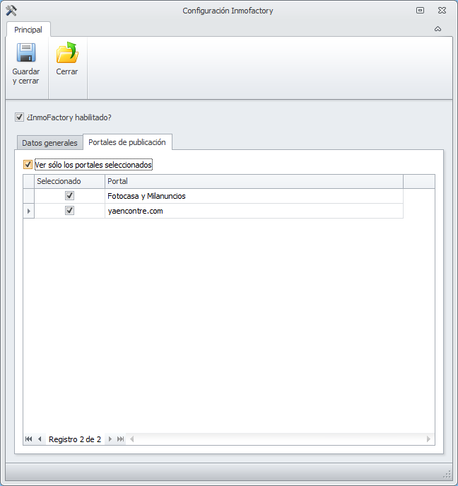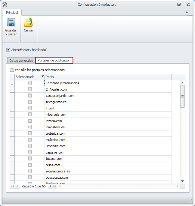 Recuerde que, activando y desactivado la casilla Ver sólo los portales seleccionados, puede ver todos los portales disponibles desde Inmofactory o sólo los que tiene activos.