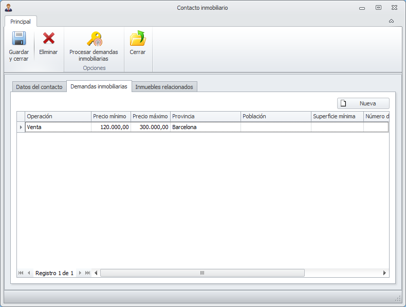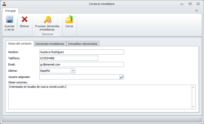 Datos de la ficha de un contacto inmobiliario