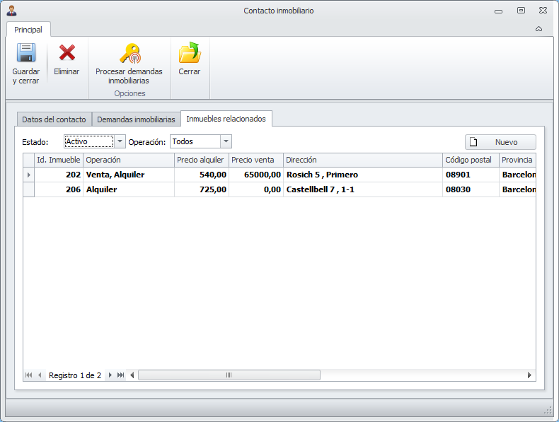 En esta pestaña se muestran aquellos inmuebles con los que ha sido relacionado este contacto en algún momento.