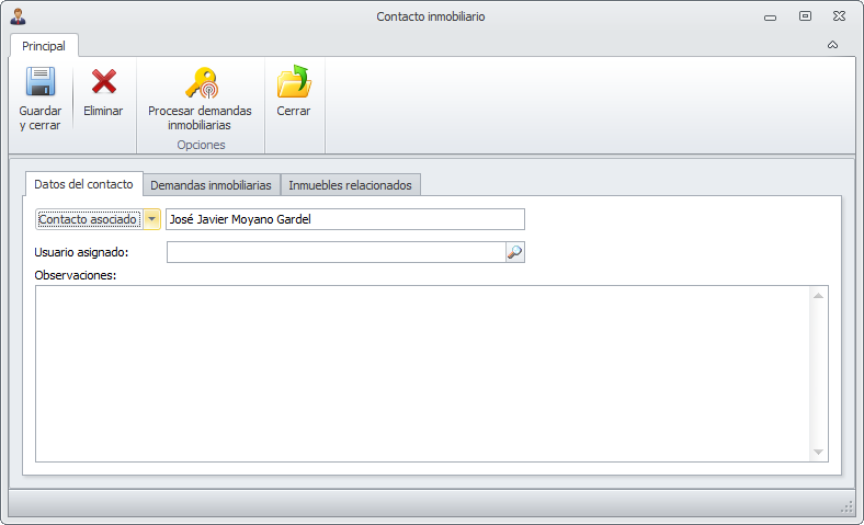 Observaciones. Puede anotar, por ejemplo, peculiaridades de los inmuebles en los que está interesado. También relaciones que pueda tener este contacto con otros que ya tenga introducidos en la base de datos.