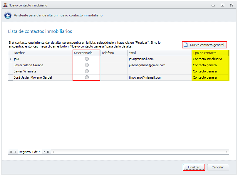 En esta ventana, la columna Seleccionado permite escoger uno de estos contactos. Al hacer clic en Finalizar: