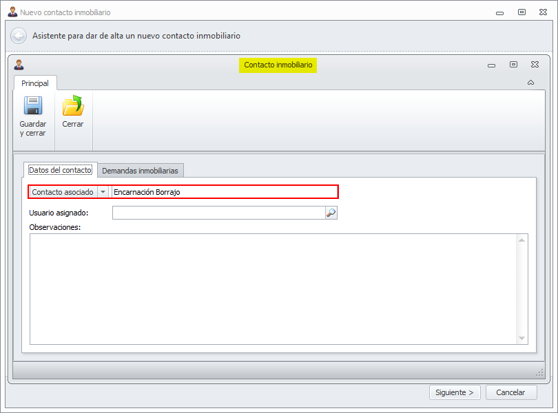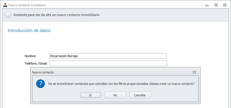 Supongamos que ha escrito “Encarnación Borrajo” en la casilla del nombre. Al hacer clic en Siguiente, Adminet localizará todos los contactos (generales e inmobiliarios) que contienen ese valor, de modo que: