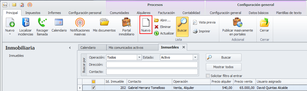 Para dar de alta un inmueble a comercializar, haga clic en Nuevo.