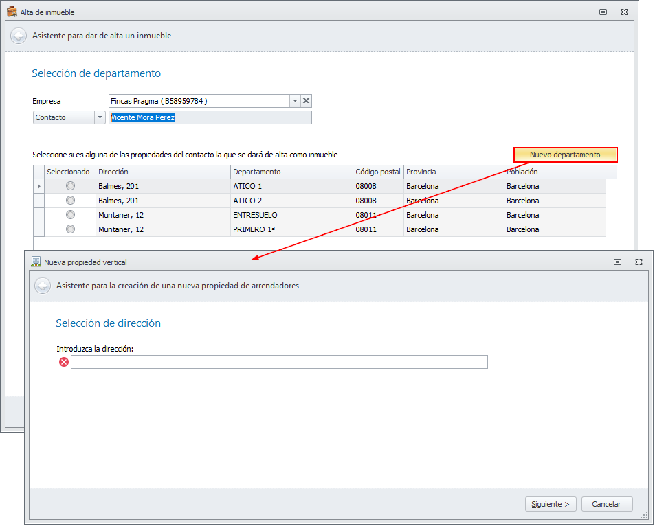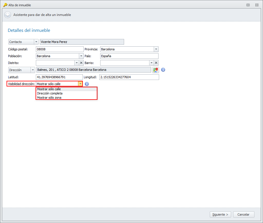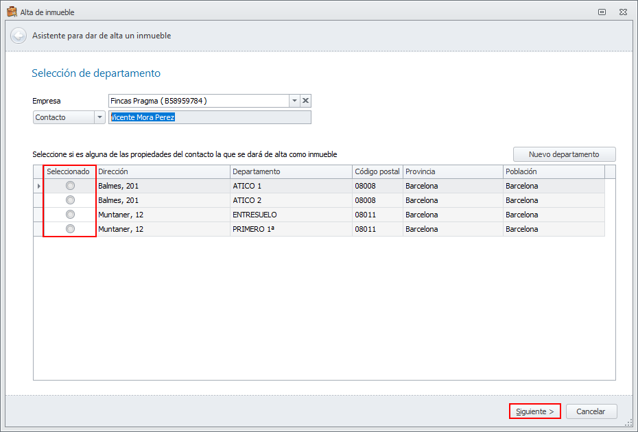 Una vez escogido el contacto, se muestran los inmuebles de los que es propietario. Si el que quiere dar de alta es alguno de ellos, selecciónelo y haga clic en Siguiente.