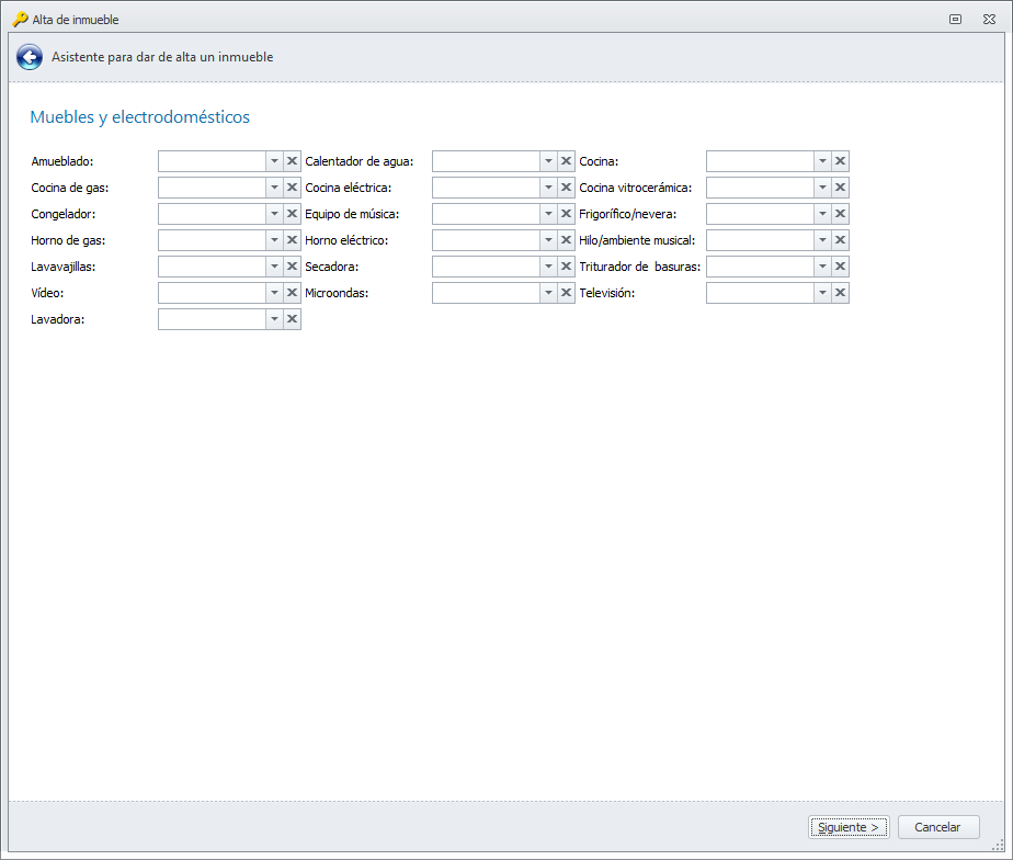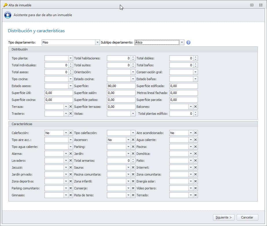 Una vez seleccionada la propiedad, se inicia el asistente para dar de alta un inmueble. La primera ventana, dispone de varias pestañas para identificar las características, distribución y contenido del inmueble.