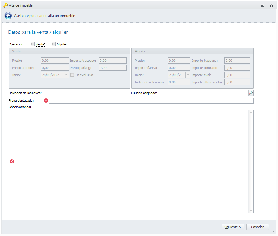 Para dar de alta inmuebles es preciso tener permisos para añadir información a diferentes entidades. Haga clic aquí para más información.