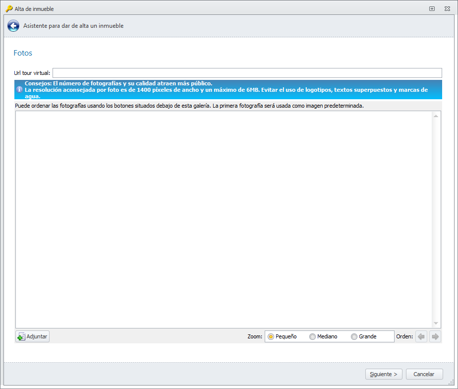 La siguiente ventana del asistente le permite añadir las fotografías correspondientes a este inmueble. El formato debe ser .JPG.