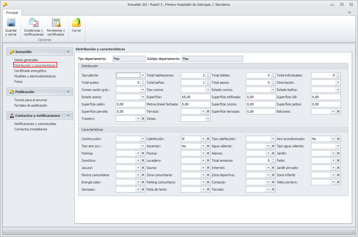 Características. Se muestran los datos existentes en la ficha del departamento relacionados con instalaciones del inmueble y la finca. Puede cambiarlos, si es preciso.
