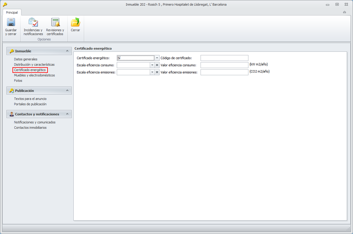 Certificado energético. Muestra los datos existentes en la ficha del departamento, correspondientes al certificado energético. Puede cambiarlos, si es preciso.