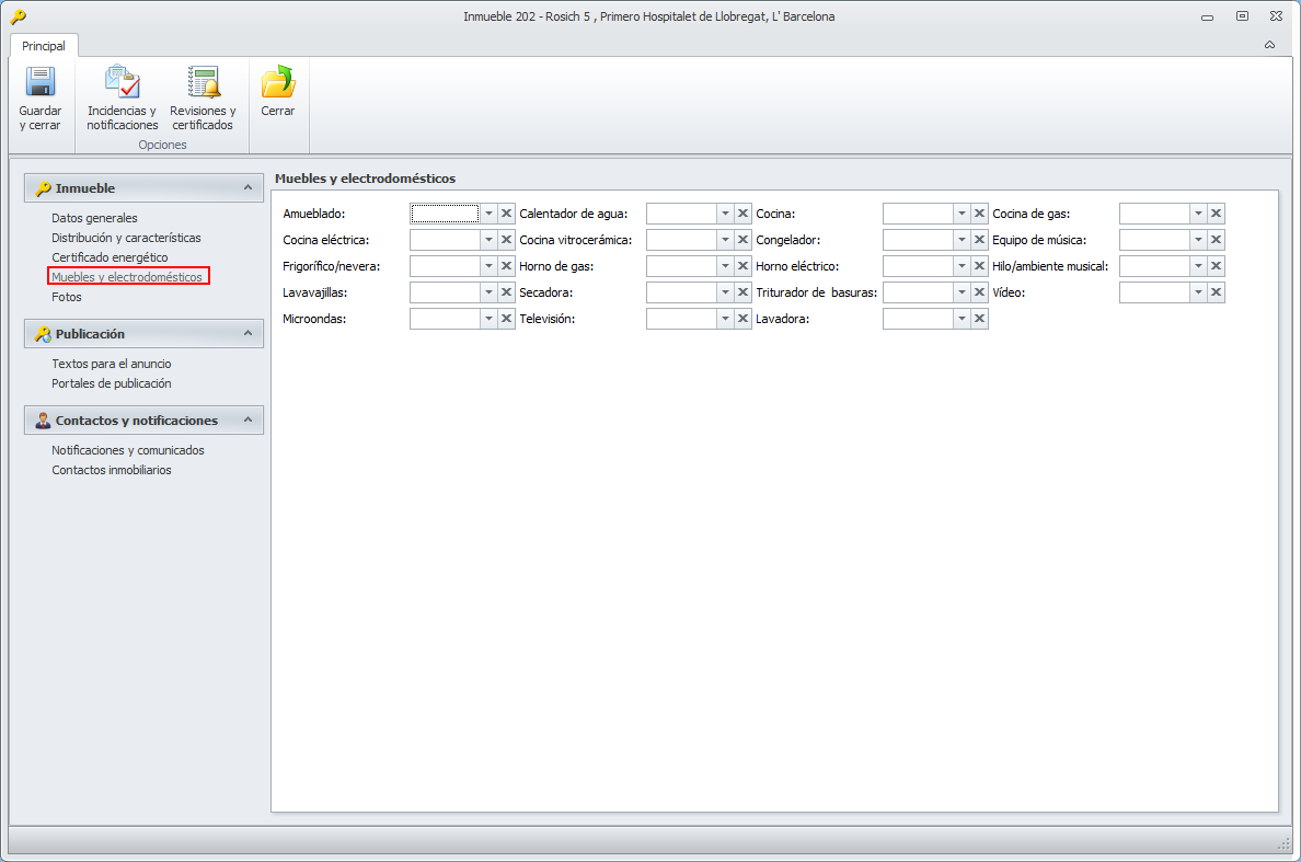 Estas secciones se mostrarán dependiendo del tipo de inmueble. Por ejemplo, para una plaza de garaje, las secciones Certificado energético y Muebles y electrodomésticos no se muestran.