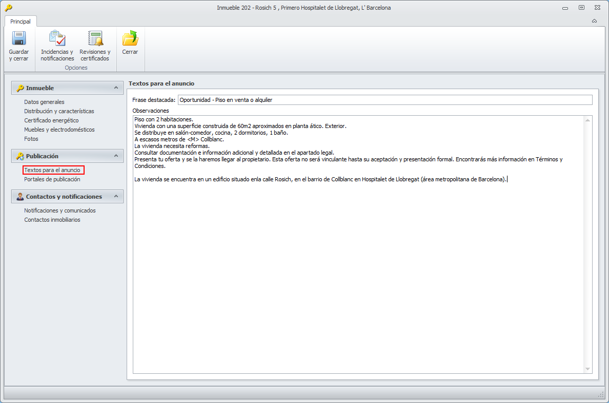 Observaciones. Es la información que se mostrará en los diferentes portales en los que se anuncie el inmueble.