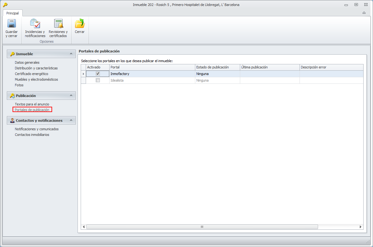 Se muestran los diferentes portales con los que se puede publicar este inmueble. La casilla Seleccionado, indica en cuáles será publicado.