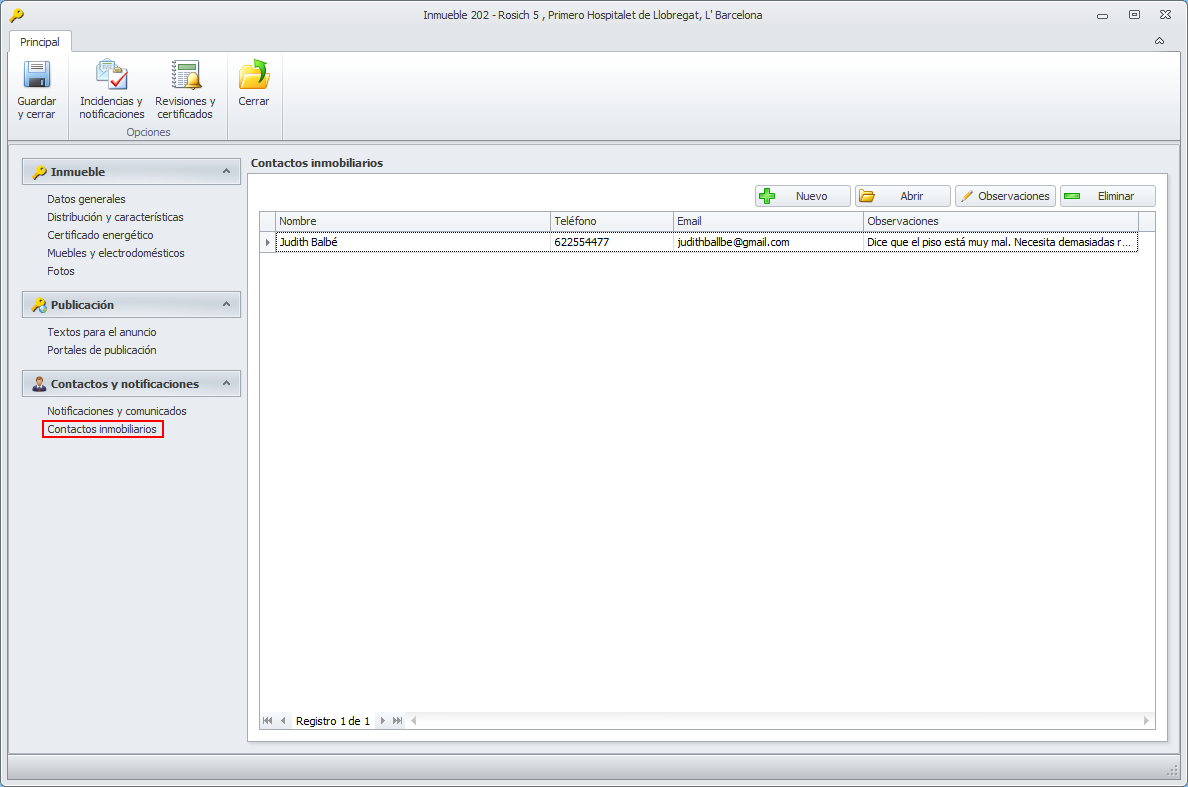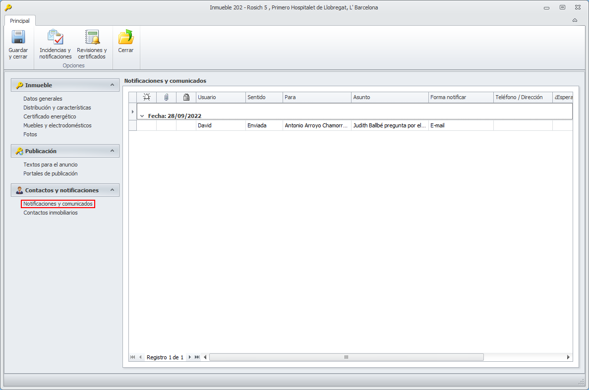 En esta sección se muestran los comunicados recibidos de Habitaclia, Fotocasa e Idealista, así como los demás comunicados y notificaciones asociados con dicho inmueble.