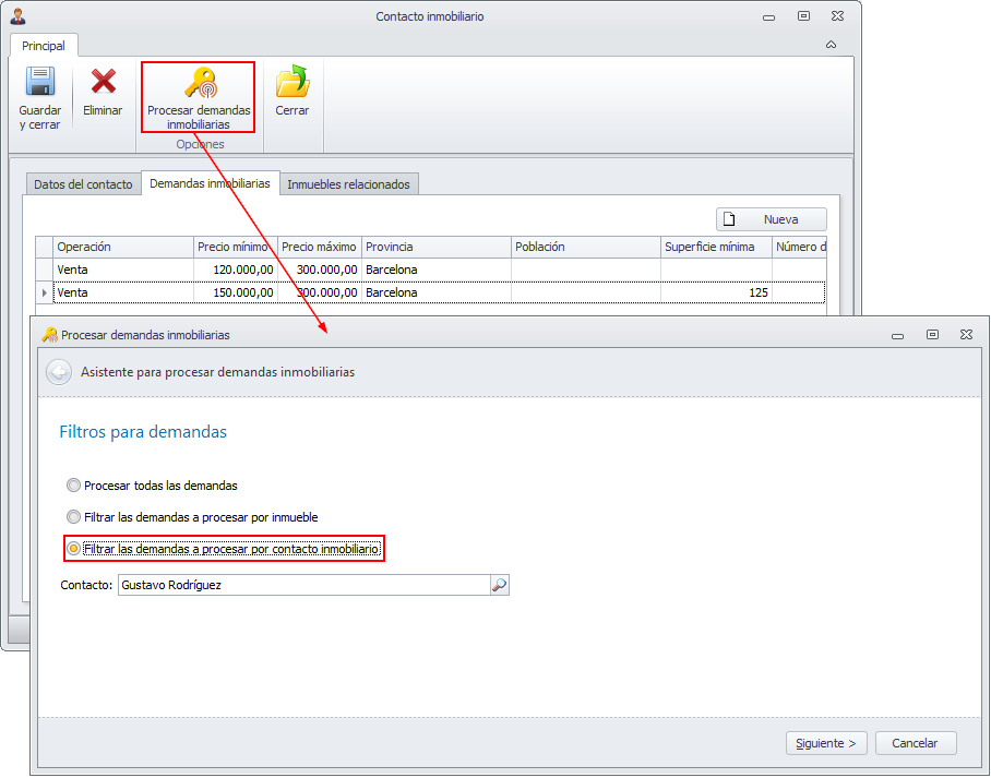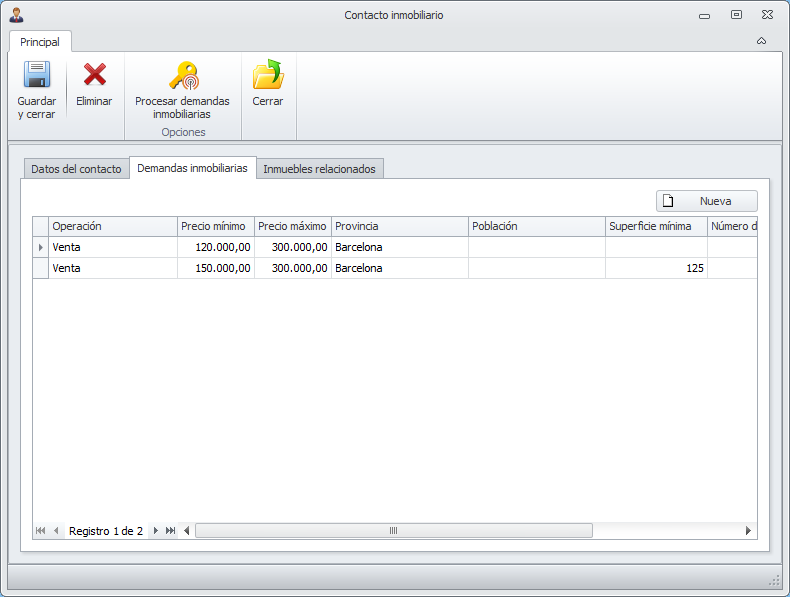 Se abre la ficha de nueva demanda para que la cumplimente. A continuación, puede hacer clic sobre el botón Procesar demandas inmobiliarias para localizar los inmuebles que cumplan las condiciones solicitadas.