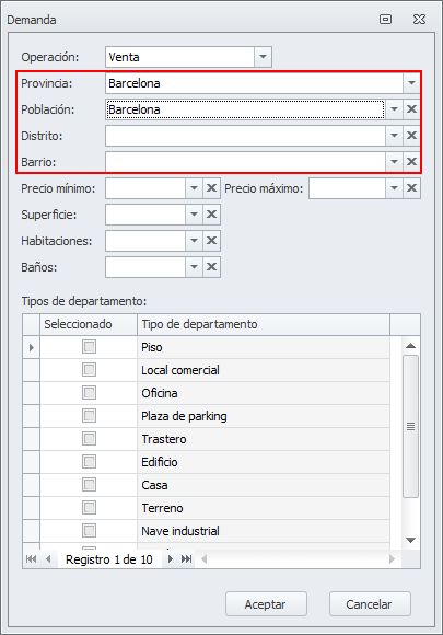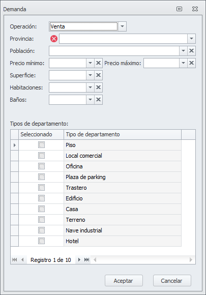 Una demanda inmobiliaria es la petición que realiza un contacto inmobiliario para localizar inmuebles en comercialización que sean de su interés. La demanda incluye el tipo de operación (venta o alquiler), tipo de inmueble, provincia o población y rango de importes.
