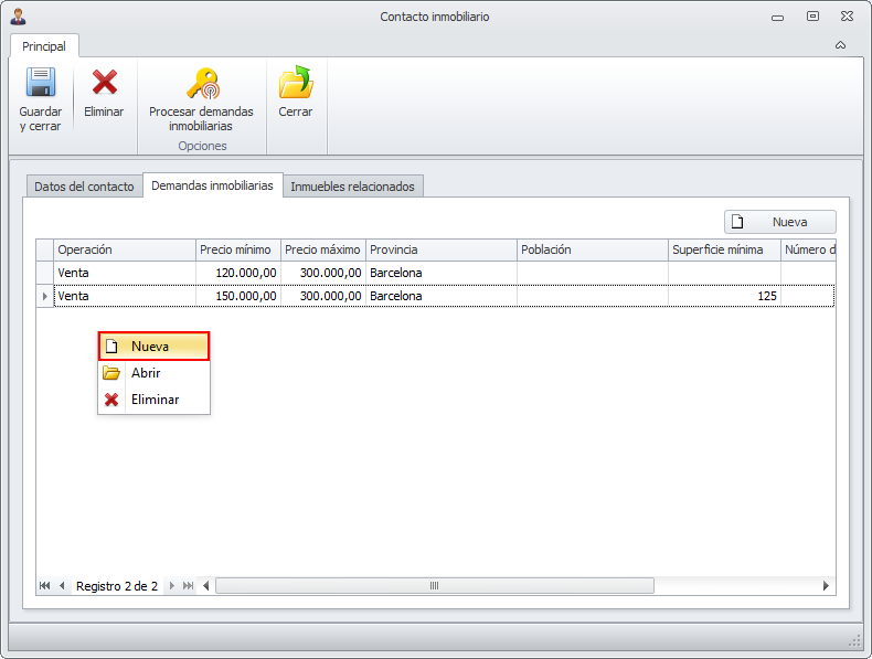 En la pestaña Demandas inmobiliarias de la ficha de un contacto inmobiliario, haga clic derecho y escoja Nueva.