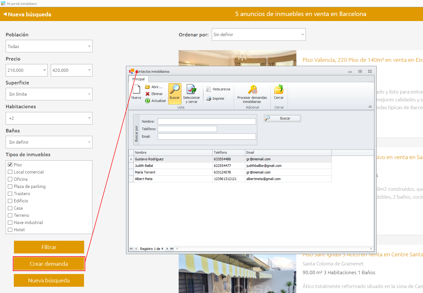 El selector de filtros del portal inmobiliario incluye un botón Crear demanda. Al pulsarlo, se solicita el contacto inmobiliario. Tras informarlo, se guarda las características solicitadas en el portal, como nueva demanda del contacto.