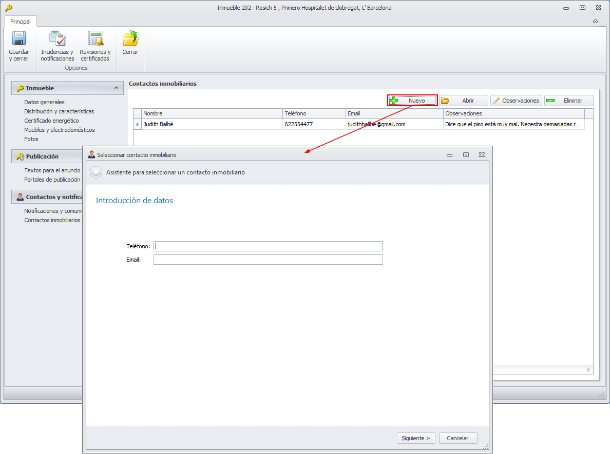 Nuevo. Este botón abre una ventana para seleccionar un contacto y añadirlo a la lista de contactos relacionados con el inmueble.